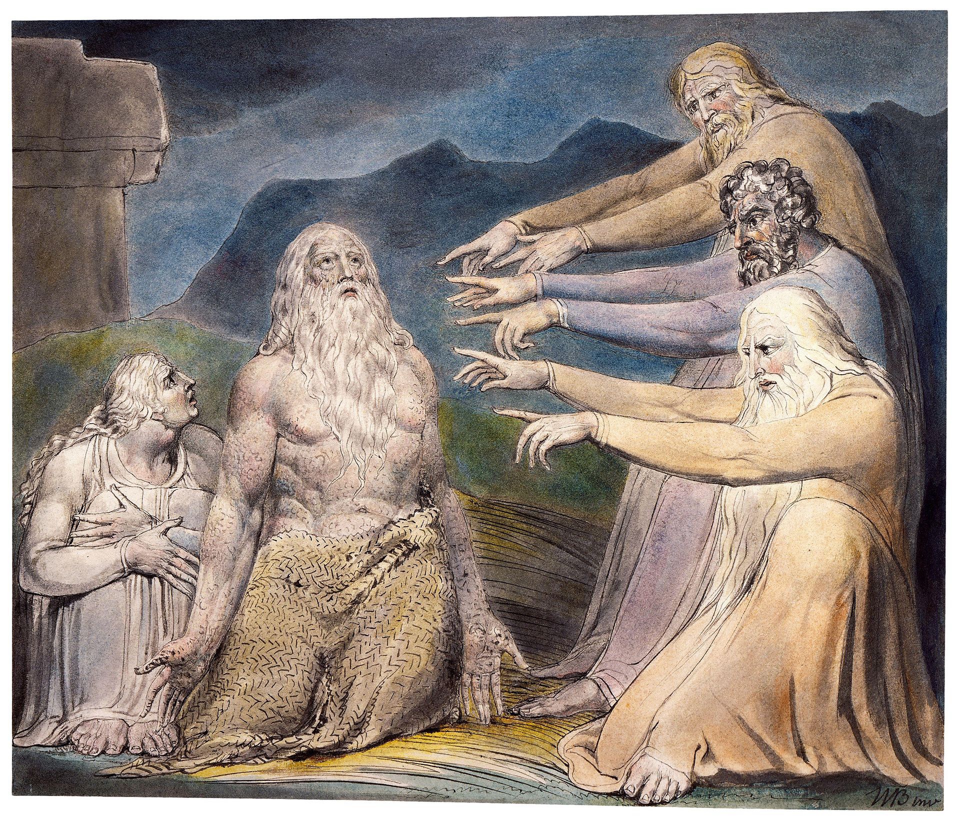 Three of Job’s friends arrive to visit him in his grief. These men come from various corners East of the River Jordan, though the modern-day locations are unclear. There’s Eliphaz the Temanite, Bildad the Shuhite, and Zophar the Naamathite. They are shocked and horrified at the change in Job’s appearance, and at the scale of his losses. In solidarity with their friend, they tear their garments, sprinkle dust on their heads, and sit in silence with him for seven days and seven nights.